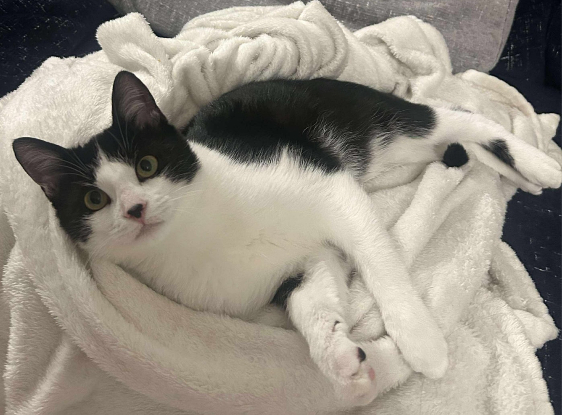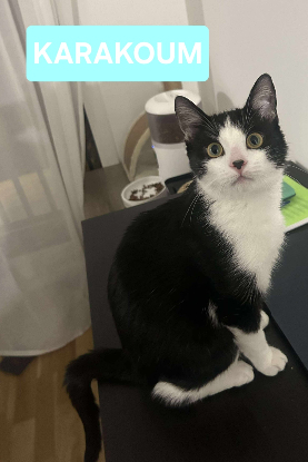 Un adorable chat estimé à 4-5 mois au pelage noir et blanc qui vous charmera. Karakoum a été retrouvé dans un carton fermé sous une voiture. Pourtant, ce n’est pas un chat apeuré ni méfiant de l’Homme. Il n’est en aucun cas timide, dès la première rencontre va vers les autres pour jouer ou des câlins. C’est un compagnon très affectueux et rapidement à l'aise. Il attend avec impatience le réveil ses propriétaire pour venir s’immiscer sous la couette. Karakoum est encore un enfant qui aime jouer avec tous les objets et les mains de ses compagnons. Il a tendence à mordiller pendant le jeu mais sans jamais d’agressivité et toujours accompagné de quelques ronrons.