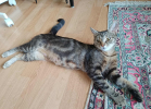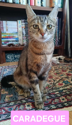 Caradègue est une belle minette aux poils soyeux, douce et câline, qui adore la présence humaine et suit sa famille d'accueil partout dans la maison.