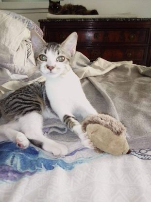 Raley, femelle de 4 mois. Une boîte à ronrons, elle s'entend très bien avec les autres chats. Visible à Montélimar chez Valerie, contact au 06.82.44.08.35