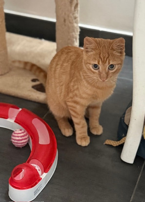 Il s’entend très bien avec les autres chats de la maison, dont il apprécie la compagnie. Le chien de la famille d’accueil, en revanche, le laisse encore un peu perplexe : Rouge Gorge préfère rester à l’étage, dans son petit cocon sécurisé.
