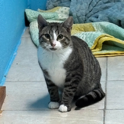 Chaussette porte bien son nom : avec ses petites marques blanches au bout des pattes, on dirait qu’il porte de jolies chaussettes ! Ce jeune chat est un vrai amour : doux, très câlin et parfaitement à l’aise avec les chats, les chiens et les enfants.