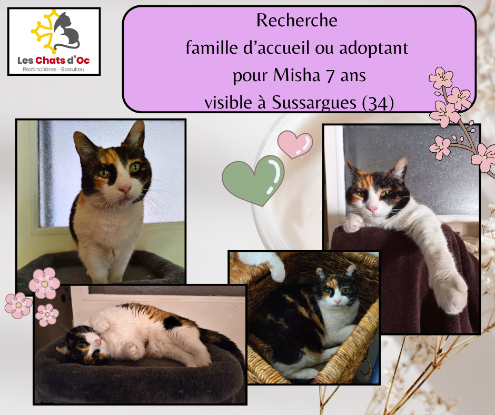 A l'adoption Misha âgée de 7 ans qui vie jusqu'à présent avec 5 autres chats, mais en vieillissant elle supporte de moins en moins les autres chats alors on lui cherche une famille sans autre chat.