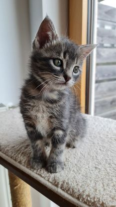 J’ai oublié de vous dire le plus important. Je suis un chaton d’une grande gentillesse et câlin qui plus est. Une fois mon ventre bien rempli, je n’aspire qu’à une chose : me blottir dans vos bras pour savourer une sieste bien méritée. Si d’aventure nous tombions « chatmoureux » l’un de l’autre, il se pourrait même qu’à la seule force de mes pattounes, je me hisse le long d’une de vos jambes afin de me lover dans vos bras et vous faire des bisous.