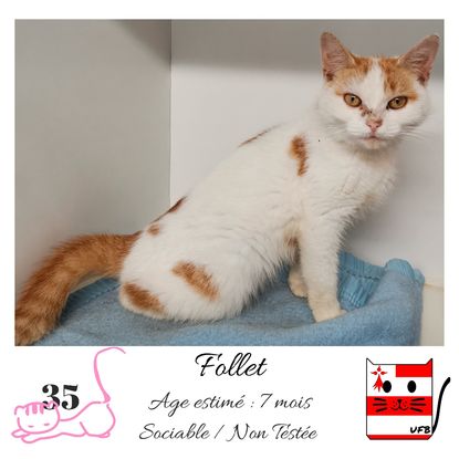 URGENCE EUTHANASIE ! Follet est une femelle de 7 mois sociable qui vous attend dans une fourrière du 35. ATTENTION SORTIE AU PLUS TARD LE 23/10/2020 (avant euthanasie) ! Pour adopter, c'est facile : ➡️ On se rend sur la page facebook d'Urgence Fourrière de Bretagne (UFB) -> https://www.facebook.com/sosfourrieresbreizh/ ➡️ On vient en message privé sur la page UFB ➡️ On remplit le questionnaire ➡️ Si le questionnaire est validé, on se rend disponible pour la pré-visite ➡️ On se rend aussi disponible pour venir chercher le loulou en fourrière Les chats sortent de fourrière primo-vaccinés et identifiés. Restera à charge de l’adoptant le rappel de vaccin et la stérilisation qui est OBLIGATOIRE. Les femelles en fourrière ayant été trouvées dans la rue, il y a fort à parier que nombre d'entre elles en âge de l'être soient gestantes ... ---- A PROPOS D'URGENCE FOURRIERE DE BRETAGNE (UFB) Nous sommes un COLLECTIF d'ASSOCIATIONS DE PROTECTION ANIMALE (qui rassemble notamment Moustaches et Compagnie, Bêtes de Scène, les Pachas, Chats Libres de Berné, etc, etc....) Le BUT de ce collectif d'associations est donc de SORTIR ces animaux des fourrières surchargées en les faisant ADOPTER de manière LEGALE par des familles ou en leur trouvant des FAMILLES D'ACCUEIL lorsque des places en association se libèrent.