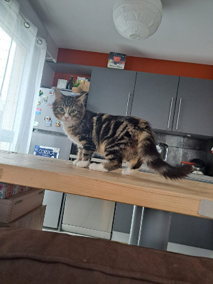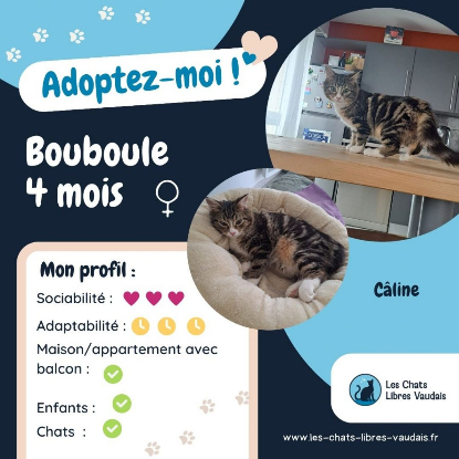 Bouboule a 4 mois, c’est une chatoune vraiment adorable ! Aussi belle que gentille, Bouboule a toutes les qualités du parfait chaton : joueuse, gourmande, câline. Son activité favorite est de monter dans l’étendoir à linge! Egalement, elle saura vous faire ses beaux yeux pour une gourmandise ou de la pâtée. Et entre nous, comment lui résister ? Bouboule aime aussi beaucoup ses humains, avec lesquels elle aime passer du temps sur le canapé. Nous ne trouvons donc aucun défaut à Bouboule, il faut le voir pour le croire !