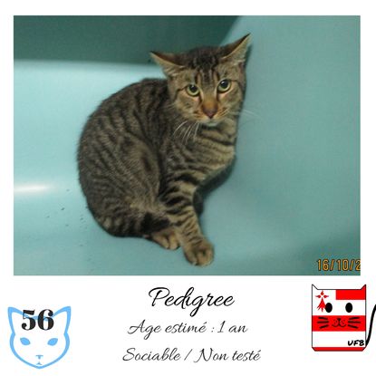 URGENCE EUTHANASIE ! Pedigrée est un mâle de 1 an sociable qui vous attend dans une fourrière du 56. ATTENTION SORTIE AU PLUS TARD LE 30/10/2020 (avant euthanasie) ! Pour adopter, c'est facile : ➡️ On se rend sur la page facebook d'Urgence Fourrière de Bretagne (UFB) -> https://www.facebook.com/sosfourrieresbreizh/ ➡️ On vient en message privé sur la page UFB ➡️ On remplit le questionnaire ➡️ Si le questionnaire est validé, on se rend disponible pour la pré-visite ➡️ On se rend aussi disponible pour venir chercher le loulou en fourrière Les chats sortent de fourrière primo-vaccinés et identifiés. Restera à charge de l’adoptant le rappel de vaccin et la stérilisation qui est OBLIGATOIRE. Les femelles en fourrière ayant été trouvées dans la rue, il y a fort à parier que nombre d'entre elles en âge de l'être soient gestantes ... ---- A PROPOS D'URGENCE FOURRIERE DE BRETAGNE (UFB) Nous sommes un COLLECTIF d'ASSOCIATIONS DE PROTECTION ANIMALE (qui rassemble notamment Moustaches et Compagnie, Bêtes de Scène, les Pachas, Chats Libres de Berné, etc, etc....) Le BUT de ce collectif d'associations est donc de SORTIR ces animaux des fourrières surchargées en les faisant ADOPTER de manière LEGALE par des familles ou en leur trouvant des FAMILLES D'ACCUEIL lorsque des places en association se libèrent.