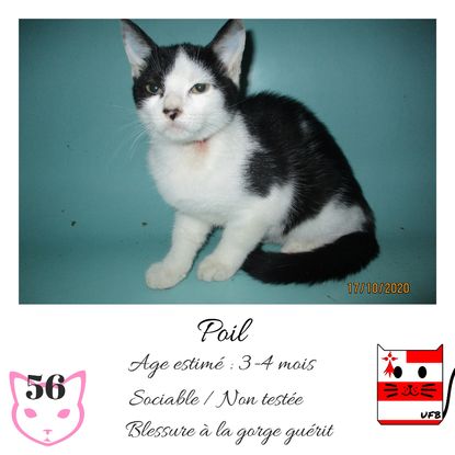 URGENCE EUTHANASIE ! Poil est une femelle de 3-4 mois sociable qui vous attend dans une fourrière du 56. ATTENTION SORTIE AU PLUS TARD LE 30/10/2020 (avant euthanasie) ! Pour adopter, c'est facile : ➡️ On se rend sur la page facebook d'Urgence Fourrière de Bretagne (UFB) -> https://www.facebook.com/sosfourrieresbreizh/ ➡️ On vient en message privé sur la page UFB ➡️ On remplit le questionnaire ➡️ Si le questionnaire est validé, on se rend disponible pour la pré-visite ➡️ On se rend aussi disponible pour venir chercher le loulou en fourrière Les chats sortent de fourrière primo-vaccinés et identifiés. Restera à charge de l’adoptant le rappel de vaccin et la stérilisation qui est OBLIGATOIRE. Les femelles en fourrière ayant été trouvées dans la rue, il y a fort à parier que nombre d'entre elles en âge de l'être soient gestantes ... ---- A PROPOS D'URGENCE FOURRIERE DE BRETAGNE (UFB) Nous sommes un COLLECTIF d'ASSOCIATIONS DE PROTECTION ANIMALE (qui rassemble notamment Moustaches et Compagnie, Bêtes de Scène, les Pachas, Chats Libres de Berné, etc, etc....) Le BUT de ce collectif d'associations est donc de SORTIR ces animaux des fourrières surchargées en les faisant ADOPTER de manière LEGALE par des familles ou en leur trouvant des FAMILLES D'ACCUEIL lorsque des places en association se libèrent.