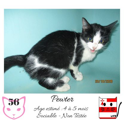 URGENCE EUTHANASIE ! Pewter est une femelle de 4-5 mois sociable qui vous attend dans une fourrière du 56. ATTENTION SORTIE AU PLUS TARD LE 30/10/2020 (avant euthanasie) ! Pour adopter, c'est facile : ➡️ On se rend sur la page facebook d'Urgence Fourrière de Bretagne (UFB) -> https://www.facebook.com/sosfourrieresbreizh/ ➡️ On vient en message privé sur la page UFB ➡️ On remplit le questionnaire ➡️ Si le questionnaire est validé, on se rend disponible pour la pré-visite ➡️ On se rend aussi disponible pour venir chercher le loulou en fourrière Les chats sortent de fourrière primo-vaccinés et identifiés. Restera à charge de l’adoptant le rappel de vaccin et la stérilisation qui est OBLIGATOIRE. Les femelles en fourrière ayant été trouvées dans la rue, il y a fort à parier que nombre d'entre elles en âge de l'être soient gestantes ... ---- A PROPOS D'URGENCE FOURRIERE DE BRETAGNE (UFB) Nous sommes un COLLECTIF d'ASSOCIATIONS DE PROTECTION ANIMALE (qui rassemble notamment Moustaches et Compagnie, Bêtes de Scène, les Pachas, Chats Libres de Berné, etc, etc....) Le BUT de ce collectif d'associations est donc de SORTIR ces animaux des fourrières surchargées en les faisant ADOPTER de manière LEGALE par des familles ou en leur trouvant des FAMILLES D'ACCUEIL lorsque des places en association se libèrent.