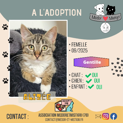 ? Alizé partira identifiée, vaccinée (typhus coryza, 2 injections) et déparasitée. La stérilisation sera à faire avant ses 6 mois (chèque de caution).