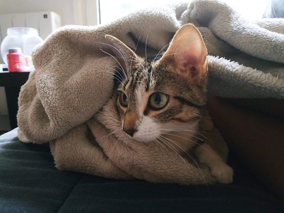 Jade est née en juin 2019. Jade est une petite chatte très calme, qui a de temps à autre des accès de folie ! ? Elle se prend alors pour un petit ninja, mais ses courses poursuites et autres galipettes se terminent souvent dans le mur... ou à moitié dans un tiroir et l'autre moitié piteusement à l'extérieur.... Elle réussit parfaitement à chasser les cotons-tiges, ainsi que ses jouets. Qu'elle peut vous apporter lors de moment d'ennui ou d'inattention de votre part ! ? Le reste du temps, elle aime se blottir sur son griffoir ou dans son arbre à chat. Elle reste en permanence dans la même pièce que ses humains de compagnie : sans être entièrement glue, elle reste un petit pot de colle. (Jusqu'aux toilettes, où l'intimité est devenue un concept abstrait.) ? Concernant les repas, Jade n'est pas fan de croquettes : elle se réserve pour la pâté. Ou vos propres repas, auxquels elle fera les yeux doux systématiquement. -Grand moment de Mioumiou. Elle devient très bavarde lorsqu'elle voit son repas être préparé. ? Elle dort toujours sur les jambes des humains et attend votre réveil pour ronronner et se blottir dans vos bras ! C'est un moteur sur pattes, la ronronthérapie est à son apogée. Jade est ok chats /ok lapins. Entente chiens inconnues. Ok enfants. Formulaire de pré-adoption : https://ninelives.fr/adopter/