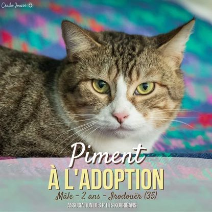 PIMENT Né le 10/08/2019 Identification par puce électronique n°250268743180509 Il attend sa famille pour la vie depuis le 26/02/2020 Piment a été recueilli avec sa mère Flora et sa sœur Choupe alors qu’ils avaient été abandonnés dans la nature. Il était de ce fait de nature très craintive au début car il avait pris l’habitude de fuir l’humain pour se protéger. Il est aujourd’hui beaucoup plus à l’aise et se laisse caresser lorsqu’il est posé sur un dodo douillet. C’est un petit père bavard qui aime discuter avec vous et roucouler. Il s’entend très bien avec les autres chats et a besoin d’avoir au moins un copain félin pour s’épanouir pleinement. Il a également l’habitude de cohabiter avec des enfants en bas âge. Il est en famille d'accueil à IRODOUER (35) Plus d'informations : https://ptits-korrigans.forums-actifs.net/t5560-piment Remplir un formulaire d’adoption : https://goo.gl/forms/AjngY2qGoL4hVxQ42 Nous contacter pour plus d’informations : [email protected] *Tous nos chats sont adoptés stérilisés, vaccinés RCP-FeLV, dépistés FIV/FELV et identifiés Crédit photo : Cécile Joussé Photographe