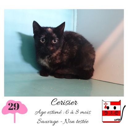 URGENCE EUTHANASIE ! Cerisier est une femelle de 6-8 mois sauvageonne (un comportement normal en fourrière) qui vous attend dans une fourrière du 29. ATTENTION SORTIE AU PLUS TARD LE 13/11/2020 (avant euthanasie) ! Pour adopter, c'est facile : ➡️ On se rend sur la page facebook d'Urgence Fourrière de Bretagne (UFB) -> https://www.facebook.com/sosfourrieresbreizh/ ➡️ On vient en message privé sur la page UFB ➡️ On remplit le questionnaire ➡️ Si le questionnaire est validé, on se rend disponible pour la pré-visite ➡️ On se rend aussi disponible pour venir chercher le loulou en fourrière Les chats sortent de fourrière primo-vaccinés et identifiés. Restera à charge de l’adoptant le rappel de vaccin et la stérilisation qui est OBLIGATOIRE. Les femelles en fourrière ayant été trouvées dans la rue, il y a fort à parier que nombre d'entre elles en âge de l'être soient gestantes ... ---- A PROPOS D'URGENCE FOURRIERE DE BRETAGNE (UFB) Nous sommes un COLLECTIF d'ASSOCIATIONS DE PROTECTION ANIMALE (qui rassemble notamment Moustaches et Compagnie, Bêtes de Scène, les Pachas, Chats Libres de Berné, etc, etc....) Le BUT de ce collectif d'associations est donc de SORTIR ces animaux des fourrières surchargées en les faisant ADOPTER de manière LEGALE par des familles ou en leur trouvant des FAMILLES D'ACCUEIL lorsque des places en association se libèrent.