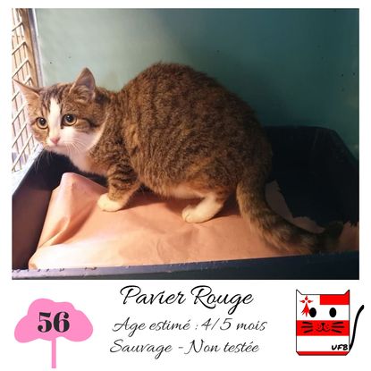 URGENCE EUTHANASIE ! Pavier Rouge est une femelle de 4-5 mois sauvageonne (un comportement normal en fourrière) qui vous attend dans une fourrière du 56. ATTENTION SORTIE AU PLUS TARD LE 13/11/2020 (avant euthanasie) ! Pour adopter, c'est facile : ➡️ On se rend sur la page facebook d'Urgence Fourrière de Bretagne (UFB) -> https://www.facebook.com/sosfourrieresbreizh/ ➡️ On vient en message privé sur la page UFB ➡️ On remplit le questionnaire ➡️ Si le questionnaire est validé, on se rend disponible pour la pré-visite ➡️ On se rend aussi disponible pour venir chercher le loulou en fourrière Les chats sortent de fourrière primo-vaccinés et identifiés. Restera à charge de l’adoptant le rappel de vaccin et la stérilisation qui est OBLIGATOIRE. Les femelles en fourrière ayant été trouvées dans la rue, il y a fort à parier que nombre d'entre elles en âge de l'être soient gestantes ... ---- A PROPOS D'URGENCE FOURRIERE DE BRETAGNE (UFB) Nous sommes un COLLECTIF d'ASSOCIATIONS DE PROTECTION ANIMALE (qui rassemble notamment Moustaches et Compagnie, Bêtes de Scène, les Pachas, Chats Libres de Berné, etc, etc....) Le BUT de ce collectif d'associations est donc de SORTIR ces animaux des fourrières surchargées en les faisant ADOPTER de manière LEGALE par des familles ou en leur trouvant des FAMILLES D'ACCUEIL lorsque des places en association se libèrent.