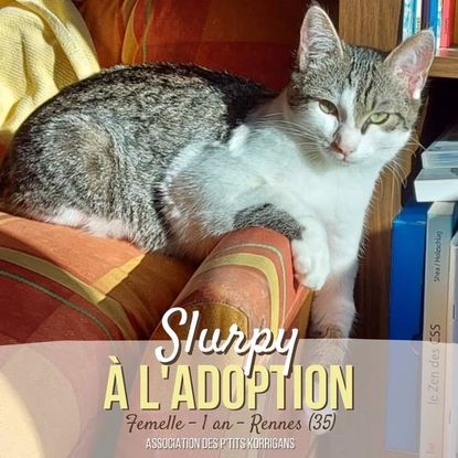 SLURPY est une chatonne tigré et blanche recueillie. Elle a commencé sa vie dans une vieille batisse à l'abandon, où elle se cachait dans les murs ! Elle a donc pris l'habitude de fuir l'humain pour se protéger. Mais après avoir été mise à l'abri avec ses soeurs et sa maman, elle a progressivement appris à cohabiter avec l'humain. Un travail de sociabilisation a été entrepris, et Slurpy se laisse maintenant caresser en douceur. Slurpy est encore timide mais une fois ses marques prises on se surprend à l'entendre ronronner en notre présence. D'un tempérament très calme , elle ne cherchera pas les querelles. Elle aime son petit confort et se prélasser sur des couvertures moelleuses. La nuit, elle vient discrètement se blottir à vos pieds. La petite slurpy sait toute de même se faire comprendre quand elle a faim, il faudra une volonté de fer pour ne pas fondre à son doux regard et pouvoir freiner ses demandes car sinon elle mangerait comme un ogre ! A la recherche d'une famille pour la vie, slurpy appréciera un environnement calme, plein de couettes et d'amour? Elle est en famille d'accueil à SAINT JACQUES DE LA LANDE (35) Plus d'informations : https://ptits-korrigans.forums-actifs.net/t5712-slurpy
