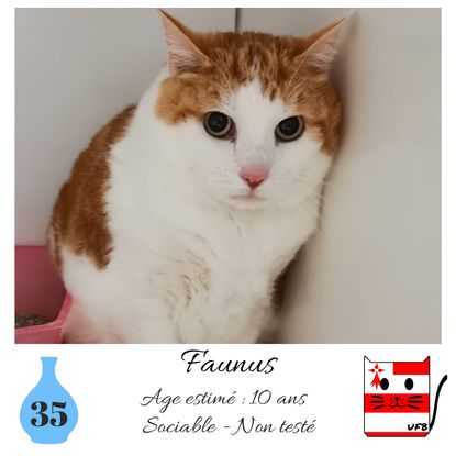 URGENCE EUTHANASIE ! Faunus est un mâle de 10 ans sociable qui vous attend dans une fourrière du 35. ATTENTION SORTIE AU PLUS TARD LE 20/11/2020 (avant euthanasie) ! Pour adopter, c'est facile : ➡️ On se rend sur la page facebook d'Urgence Fourrière de Bretagne (UFB) -> https://www.facebook.com/sosfourrieresbreizh/ ➡️ On vient en message privé sur la page UFB ➡️ On remplit le questionnaire ➡️ Si le questionnaire est validé, on se rend disponible pour la pré-visite ➡️ On se rend aussi disponible pour venir chercher le loulou en fourrière Les chats sortent de fourrière primo-vaccinés et identifiés. Restera à charge de l’adoptant le rappel de vaccin et la stérilisation qui est OBLIGATOIRE. Les femelles en fourrière ayant été trouvées dans la rue, il y a fort à parier que nombre d'entre elles en âge de l'être soient gestantes ... ---- A PROPOS D'URGENCE FOURRIERE DE BRETAGNE (UFB) Nous sommes un COLLECTIF d'ASSOCIATIONS DE PROTECTION ANIMALE (qui rassemble notamment Moustaches et Compagnie, Bêtes de Scène, les Pachas, Chats Libres de Berné, etc, etc....) Le BUT de ce collectif d'associations est donc de SORTIR ces animaux des fourrières surchargées en les faisant ADOPTER de manière LEGALE par des familles ou en leur trouvant des FAMILLES D'ACCUEIL lorsque des places en association se libèrent.