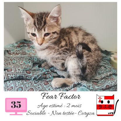URGENCE EUTHANASIE ! Fear Factor est une femelle de 2 mois sociable qui vous attend dans une fourrière du 35. ATTENTION SORTIE AU PLUS TARD LE 27/11/2020 (avant euthanasie) ! Pour adopter, c'est facile : ➡️ On se rend sur la page facebook d'Urgence Fourrière de Bretagne (UFB) -> https://www.facebook.com/sosfourrieresbreizh/ ➡️ On vient en message privé sur la page UFB ➡️ On remplit le questionnaire ➡️ Si le questionnaire est validé, on se rend disponible pour la pré-visite ➡️ On se rend aussi disponible pour venir chercher le loulou en fourrière Les chats sortent de fourrière primo-vaccinés et identifiés. Restera à charge de l’adoptant le rappel de vaccin et la stérilisation qui est OBLIGATOIRE. Les femelles en fourrière ayant été trouvées dans la rue, il y a fort à parier que nombre d'entre elles en âge de l'être soient gestantes ... ---- A PROPOS D'URGENCE FOURRIERE DE BRETAGNE (UFB) Nous sommes un COLLECTIF d'ASSOCIATIONS DE PROTECTION ANIMALE (qui rassemble notamment Moustaches et Compagnie, Bêtes de Scène, les Pachas, Chats Libres de Berné, etc, etc....) Le BUT de ce collectif d'associations est donc de SORTIR ces animaux des fourrières surchargées en les faisant ADOPTER de manière LEGALE par des familles ou en leur trouvant des FAMILLES D'ACCUEIL lorsque des places en association se libèrent.