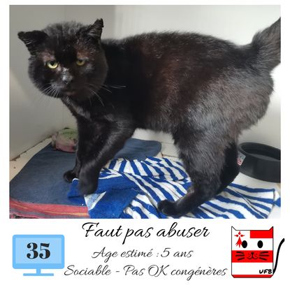 URGENCE EUTHANASIE ! Faut pas abuser est un mâle de 5 ans sociable qui vous attend dans une fourrière du 35. ATTENTION SORTIE AU PLUS TARD LE 27/11/2020 (avant euthanasie) ! Pour adopter, c'est facile : ➡️ On se rend sur la page facebook d'Urgence Fourrière de Bretagne (UFB) -> https://www.facebook.com/sosfourrieresbreizh/ ➡️ On vient en message privé sur la page UFB ➡️ On remplit le questionnaire ➡️ Si le questionnaire est validé, on se rend disponible pour la pré-visite ➡️ On se rend aussi disponible pour venir chercher le loulou en fourrière Les chats sortent de fourrière primo-vaccinés et identifiés. Restera à charge de l’adoptant le rappel de vaccin et la stérilisation qui est OBLIGATOIRE. Les femelles en fourrière ayant été trouvées dans la rue, il y a fort à parier que nombre d'entre elles en âge de l'être soient gestantes ... ---- A PROPOS D'URGENCE FOURRIERE DE BRETAGNE (UFB) Nous sommes un COLLECTIF d'ASSOCIATIONS DE PROTECTION ANIMALE (qui rassemble notamment Moustaches et Compagnie, Bêtes de Scène, les Pachas, Chats Libres de Berné, etc, etc....) Le BUT de ce collectif d'associations est donc de SORTIR ces animaux des fourrières surchargées en les faisant ADOPTER de manière LEGALE par des familles ou en leur trouvant des FAMILLES D'ACCUEIL lorsque des places en association se libèrent.