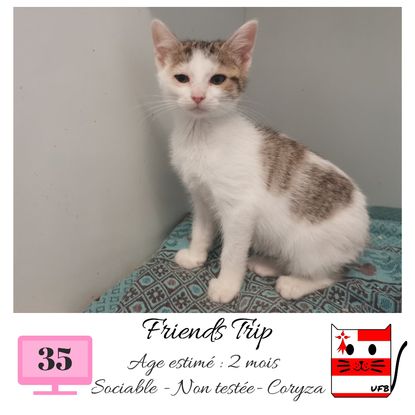 URGENCE EUTHANASIE ! Friends Trip est une femelle de 2 mois sociable qui vous attend dans une fourrière du 35. ATTENTION SORTIE AU PLUS TARD LE 27/11/2020 (avant euthanasie) ! Pour adopter, c'est facile : ➡️ On se rend sur la page facebook d'Urgence Fourrière de Bretagne (UFB) -> https://www.facebook.com/sosfourrieresbreizh/ ➡️ On vient en message privé sur la page UFB ➡️ On remplit le questionnaire ➡️ Si le questionnaire est validé, on se rend disponible pour la pré-visite ➡️ On se rend aussi disponible pour venir chercher le loulou en fourrière Les chats sortent de fourrière primo-vaccinés et identifiés. Restera à charge de l’adoptant le rappel de vaccin et la stérilisation qui est OBLIGATOIRE. Les femelles en fourrière ayant été trouvées dans la rue, il y a fort à parier que nombre d'entre elles en âge de l'être soient gestantes ... ---- A PROPOS D'URGENCE FOURRIERE DE BRETAGNE (UFB) Nous sommes un COLLECTIF d'ASSOCIATIONS DE PROTECTION ANIMALE (qui rassemble notamment Moustaches et Compagnie, Bêtes de Scène, les Pachas, Chats Libres de Berné, etc, etc....) Le BUT de ce collectif d'associations est donc de SORTIR ces animaux des fourrières surchargées en les faisant ADOPTER de manière LEGALE par des familles ou en leur trouvant des FAMILLES D'ACCUEIL lorsque des places en association se libèrent.
