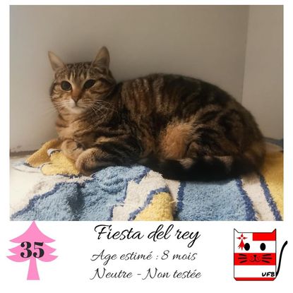 URGENCE EUTHANASIE ! Fiesta del Rey est une femelle de 8 mois qui vous attend dans une fourrière du 35. ATTENTION SORTIE AU PLUS TARD LE 5/12/2020 (avant euthanasie) ! Pour adopter, c'est facile : ➡️ On se rend sur la page facebook d'Urgence Fourrière de Bretagne (UFB) -> https://www.facebook.com/sosfourrieresbreizh/ ➡️ On vient en message privé sur la page UFB ➡️ On remplit le questionnaire ➡️ Si le questionnaire est validé, on se rend disponible pour la pré-visite ➡️ On se rend aussi disponible pour venir chercher le loulou en fourrière Les chats sortent de fourrière primo-vaccinés et identifiés. Restera à charge de l’adoptant le rappel de vaccin et la stérilisation qui est OBLIGATOIRE. Les femelles en fourrière ayant été trouvées dans la rue, il y a fort à parier que nombre d'entre elles en âge de l'être soient gestantes ... ---- A PROPOS D'URGENCE FOURRIERE DE BRETAGNE (UFB) Nous sommes un COLLECTIF d'ASSOCIATIONS DE PROTECTION ANIMALE (qui rassemble notamment Moustaches et Compagnie, Bêtes de Scène, les Pachas, Chats Libres de Berné, etc, etc....) Le BUT de ce collectif d'associations est donc de SORTIR ces animaux des fourrières surchargées en les faisant ADOPTER de manière LEGALE par des familles ou en leur trouvant des FAMILLES D'ACCUEIL lorsque des places en association se libèrent.