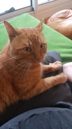 Il n'est pas joueur et pour tout dire il n'est pas très adroit non plus (il roule jusqu'à chuter 1/2 pendant ses siestes et n'est pas très assuré dans ses sauts) mais il est très affectueux et réclame des caresses dès qu'on lui accorde de l'attention. Il a bien vite fait de se coller à moi pour faire sa sieste (sur un plaid, sur des genoux, de préférence) depuis le 1er jour de son arrivé malgré son stress apparent.