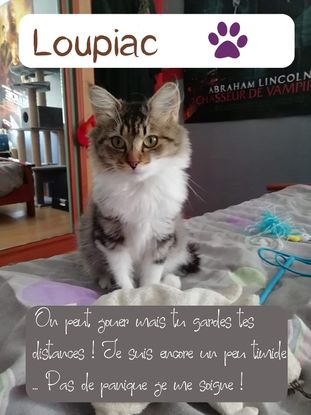 Hello, moi c'est Loupiac ! J'ai été sortie de fourrière grâce à Urgences Fourrières de Bretagne (UFB) qui m'a ensuite confié à l'association. J'ai 1 an et 2 mois. Je suis très très peureuse mais certaines personnes arrivent quand même à me caresser. Pour mon évolution j'aurais besoin d'un copain chat et/ou chien, et oui même si les humains me font un peu peur, les chiens j'aime bien ! Malgré ma peur, je ronronne et joue, mais comme tout chat qui se respecte, je suis une grande dormeuse. J'aime dormir sur le canapé avec un bon plaid ! J'aime également être près des humains et de mes congénères. Quand on a ma confiance, j'apprécie beaucoup les caresses mais pas être prise dans les bras. J'aurais aussi besoin d'une Famille calme sans enfants de moins de 15 ans. Quand je joue avec les mains ou les pieds des humains, j'ai la sale mani de mordiller mais sans agressivité ! Venez me rencontrer dans ma SUPER Famille d'Accueil à Saint-Jean-Brévelay (56). Formulaire de Pré Adoption : https://docs.google.com/forms/d/e/1FAIpQLSeO_7R3eIOTNdox-jdtJHhUttJ9VH_I3yX7LM086y9NS6fYtw/viewform?usp=sf_link