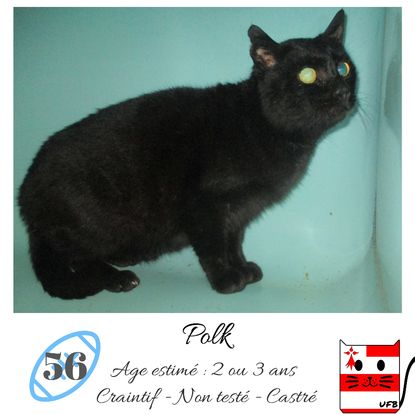 URGENCE EUTHANASIE ! Polk est un mâle de 2-3 ans craintif (un comportement normal en fourrière) qui vous attend dans une fourrière du 56. ATTENTION SORTIE AU PLUS TARD LE 29/01/2021 (avant euthanasie) ! Pour adopter, c'est facile : ➡️ On se rend sur la page facebook d'Urgence Fourrière de Bretagne (UFB) -> https://www.facebook.com/sosfourrieresbreizh/ ➡️ On vient en message privé sur la page UFB ➡️ On remplit le questionnaire ➡️ Si le questionnaire est validé, on se rend disponible pour la pré-visite ➡️ On se rend aussi disponible pour venir chercher le loulou en fourrière Les chats sortent de fourrière primo-vaccinés et identifiés. Restera à charge de l’adoptant le rappel de vaccin et la stérilisation qui est OBLIGATOIRE. Les femelles en fourrière ayant été trouvées dans la rue, il y a fort à parier que nombre d'entre elles en âge de l'être soient gestantes ... ---- A PROPOS D'URGENCE FOURRIERE DE BRETAGNE (UFB) Nous sommes un COLLECTIF d'ASSOCIATIONS DE PROTECTION ANIMALE (qui rassemble notamment Moustaches et Compagnie, Bêtes de Scène, les Pachas, Chats Libres de Berné, etc, etc....) Le BUT de ce collectif d'associations est donc de SORTIR ces animaux des fourrières surchargées en les faisant ADOPTER de manière LEGALE par des familles ou en leur trouvant des FAMILLES D'ACCUEIL lorsque des places en association se libèrent.