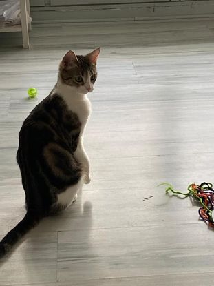 Hibu est une femelle tabby et blanche d'environ 1 an et 4 mois. Hibu est une chatte adorable et sociable. Elle est plutôt indépendante, mais adore les séances câlins et est très joueuse. Ententes connues : ok chats, ok enfants Elle a reçu plusieurs soins vétérinaires : → identification par une puce électronique → vaccination contre le typhus et le coryza → stérilisation Un test FIV/FeLV a été réalisé : il est négatif pour les deux. Elle est adoptable contre une participation aux frais vétérinaires (165 euros).