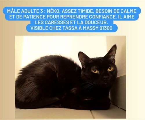 • Santé : NEKO 1 AN ET DEMI SAUVETAGE AUBERVILLIERS NEKO, jeune mâle assez timide, besoin de calme et de patience pour reprendre confiance. Il aime les caresses et la douceur. ADOPTABLE IDF ET 33 Notre association est basée à Vallauris (06) mais nous avons des fa
