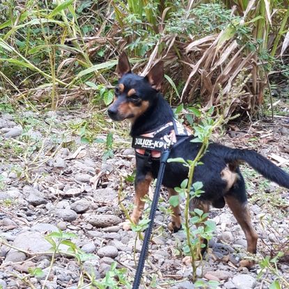 Comme beaucoup d'autres loulous, MAX errait seul dans un sentier lorsque Manon (membre de l'association) qui faisait son footing avec sa chienne le croisa. Il semblait fatigué et très heureux que quelqu'un le remarque. Un monsieur du secteur nous indiqua qu'il traînait là depuis ce matin. Impossible pour Manon de le laisser, d'autant plus qu'il était dans un chemin en bord de rivière et qu'un cyclone était prévu dès le lendemain !