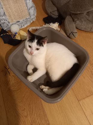 Curieux, taquin et joueur tant avec ses copains chats qu'avec son humain, il est adorable avec sa bouille de bébé.