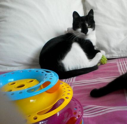 Paloma, cette jeune maman courage, beauté noire et blanche au regard masqué, est une merveilleuse minette très douce. Elle aime venir chercher les câlins mais n'est pas pour l'instant un chat genou bienqu'elle  aime venir s'installer à proximité de son humain si celui-ci s'installe confortablement. Paloma aime aussi que l'on joue avec elle,elle adore les balles qui rebondissent et les souris en peluche. Il faudra faire preuve d'un petit peu de patience et de douceur pour lui permettre d'exprimer ce qu'elle est, une adorable minette, gentille,calme et douce.