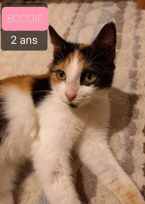 Boogie est une chatte de 2 ans douce, câline et sensible....très sensible même, à tel point qu'elle développe des réactions dermato pouvant entraîner lésions et alopécie. Actuellement sous traitement corticoïde, il lui faudra donc un environnement stable, sécure et beaucoup de douceur afin qu'elle y trouve l'apaisement. L'association prendra en charge les frais vétérinaire liés à cette pathologie si cela devait s'avèrer chronique (pas de diagnostic définitif pour le moment) Une fois en confiance, Boogie se révèle être très affectueuse, joueuse et acrobate Elle a besoin de ses moments de solitude, mais ce n'est que pour mieux partager des moments de complicité juste après ! On évitera les congénères chatons plein de fougue qui peuvent parfois l'agacer, notamment lorsqu'elle a ses démangeaisons. Pas ok chiens non plus. Visible chez Camille à MÉRIGNAC. Adoptable 33 et IDF
