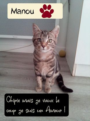 Salut tout le monde, Je m'appelle Manou, mais je préfère Lara Croft. Je suis une nénette qui aime jouer, grimper partout, sauter de meuble en meuble. Je suis une indépendante, j'aime bien les caresses mais pas trop longtemps. Je préfère courir après les jouets. J'apprécie les autres chats et surtout les embêter. J'ai un chien qui habite chez moi, et je l'accepte aussi ! Je crois que c'est un défaut, mais j'ai entendue ma Famille d'Accueil dire que si j'avais été un mâle, elle m'aurait appelé Chiper. Car c'est vrai que j'adore prendre les choses que je peux mettre dans ma bouche et me sauver avec. Il ne faut rien laisser, même la nourriture ! Venez me rencontrer chez ma SUPER Famille d'Accueil sur Retiers dans le 35. Formulaire de Pré Adoption : https://docs.google.com/forms/d/e/1FAIpQLSeO_7R3eIOTNdox-jdtJHhUttJ9VH_I3yX7LM086y9NS6fYtw/viewform?usp=sf_link