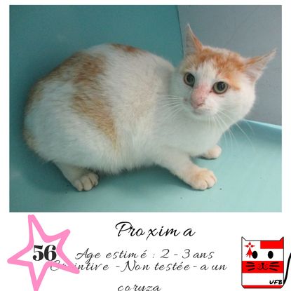 URGENCE EUTHANASIE ! Proxima est une femelle de 2-3 ans craintive (un comportement normal en fourrière) qui vous attend dans une fourrière du 56. ATTENTION SORTIE AU PLUS TARD LE 7/05/2021 (avant euthanasie) ! Pour adopter, c'est facile : ➡️ On se rend sur la page facebook d'Urgence Fourrière de Bretagne (UFB) -> https://www.facebook.com/sosfourrieresbreizh/ ➡️ On vient en message privé sur la page UFB ➡️ On remplit le questionnaire ➡️ Si le questionnaire est validé, on se rend disponible pour la pré-visite ➡️ On se rend aussi disponible pour venir chercher le loulou en fourrière Les chats sortent de fourrière primo-vaccinés et identifiés. Restera à charge de l’adoptant le rappel de vaccin et la stérilisation qui est OBLIGATOIRE. Les femelles en fourrière ayant été trouvées dans la rue, il y a fort à parier que nombre d'entre elles en âge de l'être soient gestantes ... ---- A PROPOS D'URGENCE FOURRIERE DE BRETAGNE (UFB) Nous sommes un COLLECTIF d'ASSOCIATIONS DE PROTECTION ANIMALE (qui rassemble notamment Moustaches et Compagnie, Bêtes de Scène, les Pachas, Chats Libres de Berné, etc, etc....) Le BUT de ce collectif d'associations est donc de SORTIR ces animaux des fourrières surchargées en les faisant ADOPTER de manière LEGALE par des familles ou en leur trouvant des FAMILLES D'ACCUEIL lorsque des places en association se libèrent.