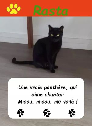 C’est moi Rasta. Petite panthère au beau pelage noir, il faudra un peu de patience pour m’amadouer. Pourtant la vie de famille c’est vraiment pour moi : si on m’en laisse le temps, je deviendrais votre compagnon idéal. Dans ma famille d’accueil tout le monde m’adore : chat, chien, humains … Je ne laisse personne indifférent. En parfaite santé, une belle vie devant moi, je suis cependant FIV+ quelques précautions seront donc à prévoir : pas de sorties en extérieur et pas de copains chats FIV négatifs, pour que je ne transmette pas le virus. Et comme le chantait Bob Marley : « One Love ! One Heart ! Let's get together and feel all right.” Venez me rencontrer à Guidel (56) pour une adoption responsable et durable, vous ne devriez pas être déçus. Formulaire de Pré Adoption : https://docs.google.com/forms/d/e/1FAIpQLSeO_7R3eIOTNdox-jdtJHhUttJ9VH_I3yX7LM086y9NS6fYtw/viewform?fbclid=IwAR3Dcm1EjUC9J_7VomZ-vkRMBUJ6m5wEDm0vAvCJsCUsJos1bRWCcVuuvtA